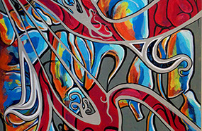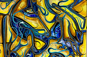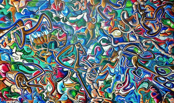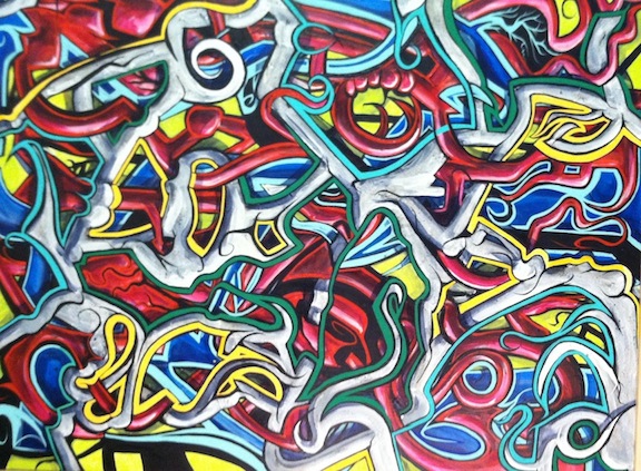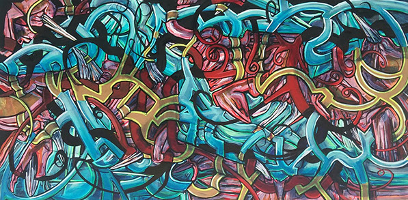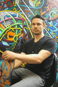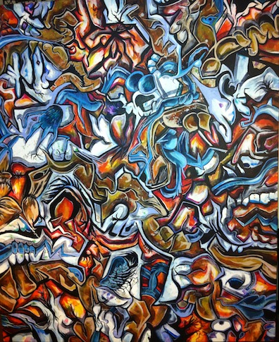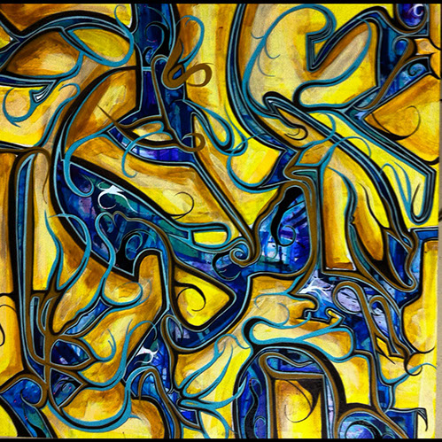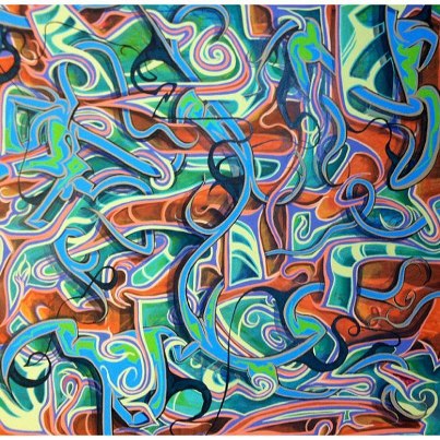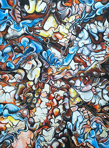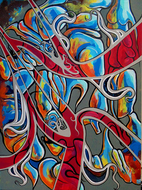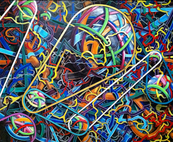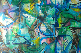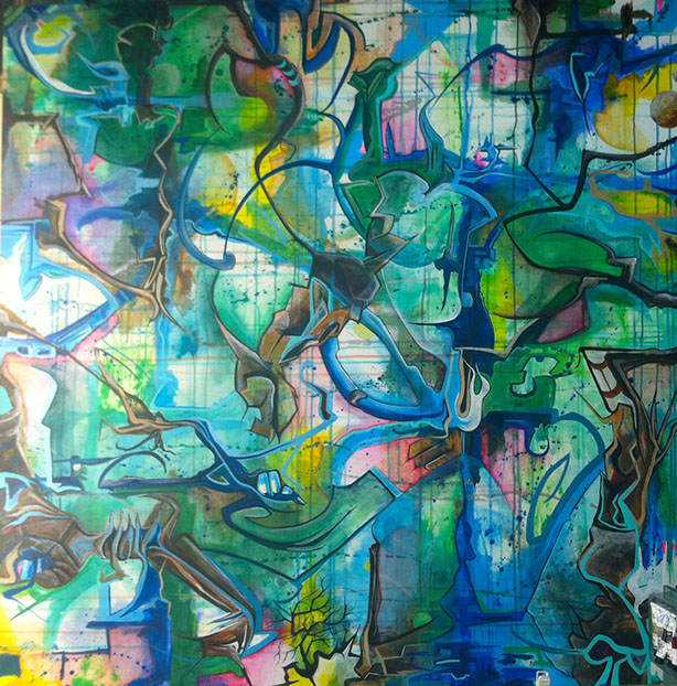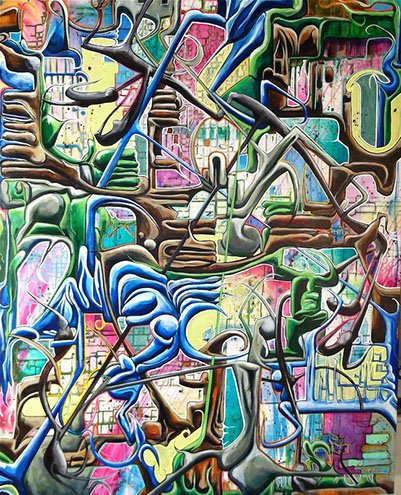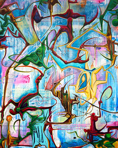 Matthew's paintings are highly complex, with colorful organic shapes presenting themselves through many layers.